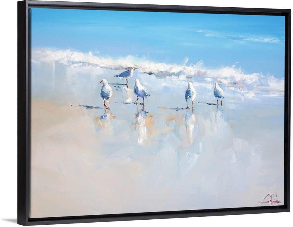 <p>A contemporary painting of seagulls walking along the beach waves.</p>