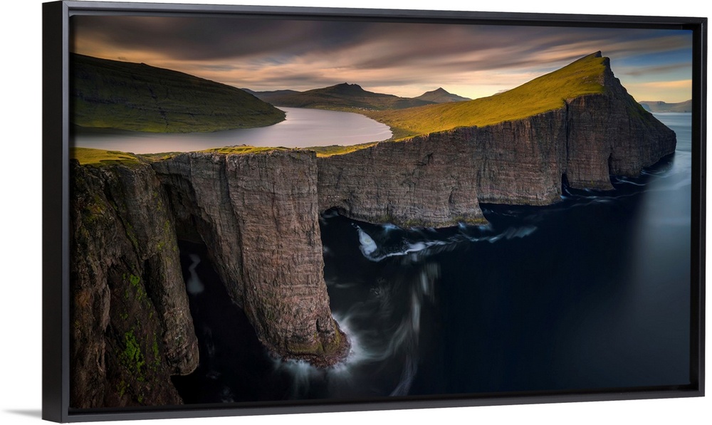 <p>Sorvagsvatn lake on cliffs of Vagar island in sunset, Faroe islands.</p>