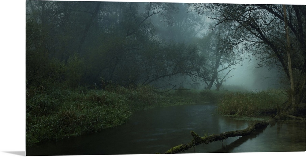 <p>A gloomy swamp in the forest full of mist.</p>