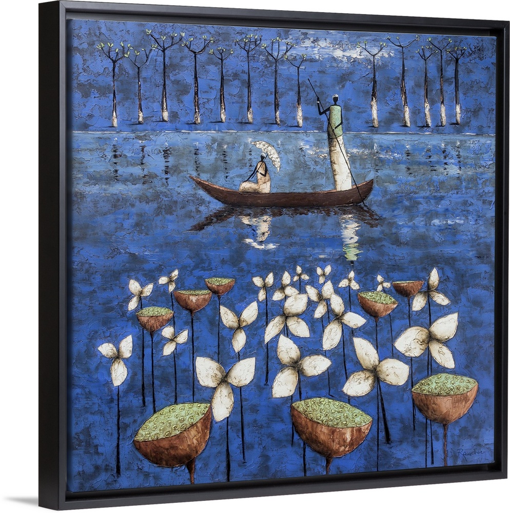 <p>Contemporary painting of two figures in a boat on the river.</p>