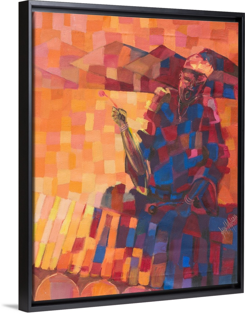 <p>The colors of the Ghanaian sunset shed light on a Hausa man as he plays the xylophone to accompany his song. Music is part of everyday life, believes John Atta Mensah, finding inspiration in tradition. He paints with acrylics in a melodious combination of orange, red, blue, and yellow hues.</p>