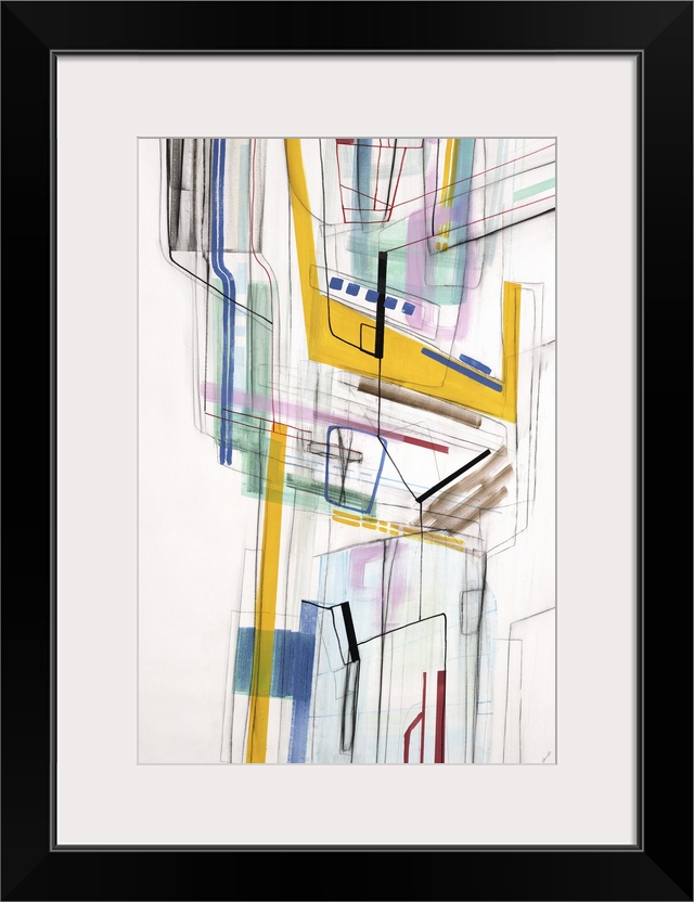 <p>Large vertical modern artwork of multi-colored lines interlacing.</p>