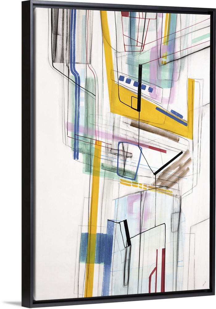 <p>Large vertical modern artwork of multi-colored lines interlacing.</p>