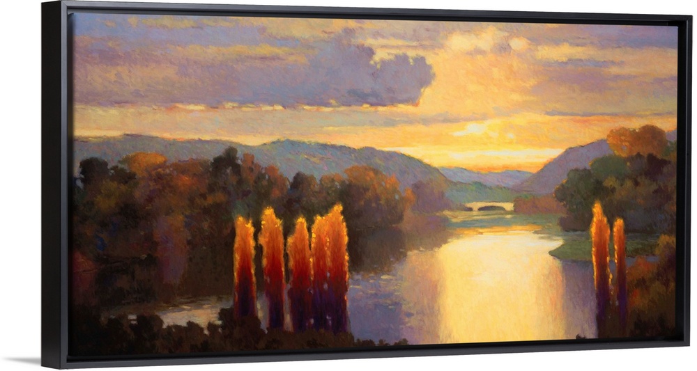 <p>Contemporary painting of a river lined with dense forests at dawn, with golden clouds in the sky.</p>