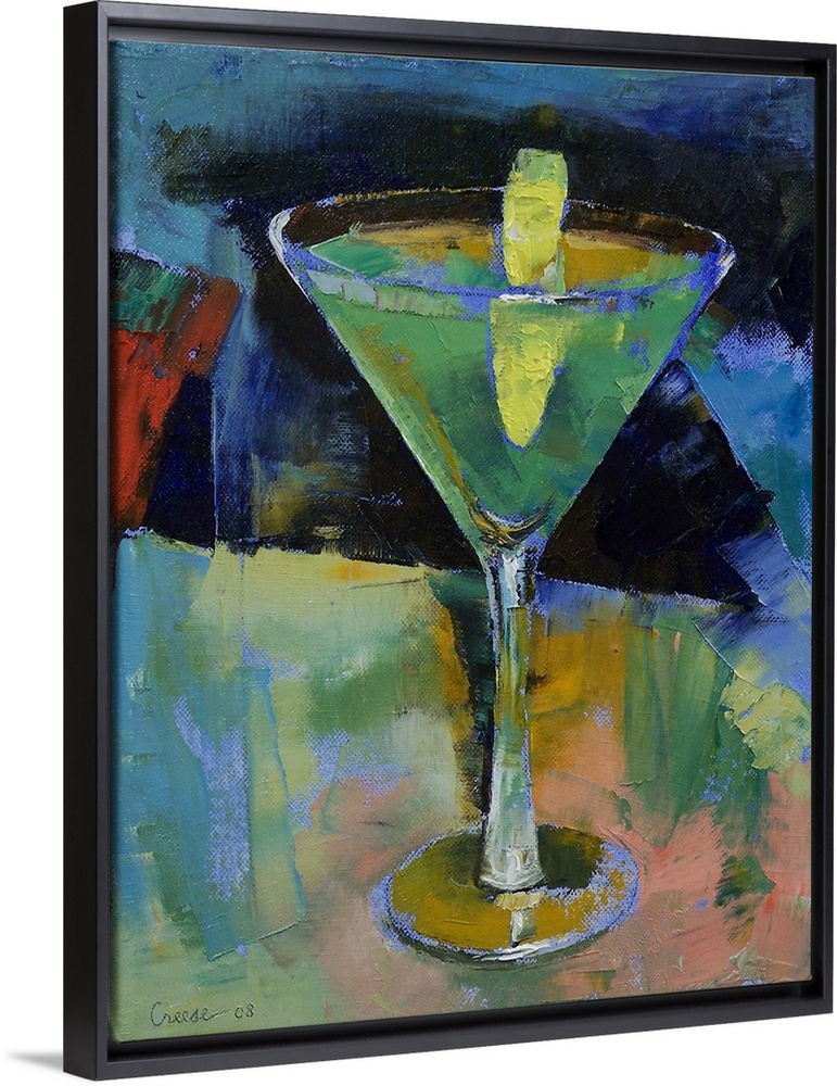<p>Big vertical contemporary painting of a sour apple martini, in a clear martini glass with a single slice of apple in it. Painted with thick, patchy transitions of oil paint.</p>