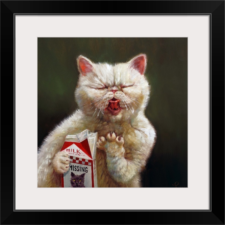 <p>A funny contemporary painting of a cat licking milk from a milk carton.</p>