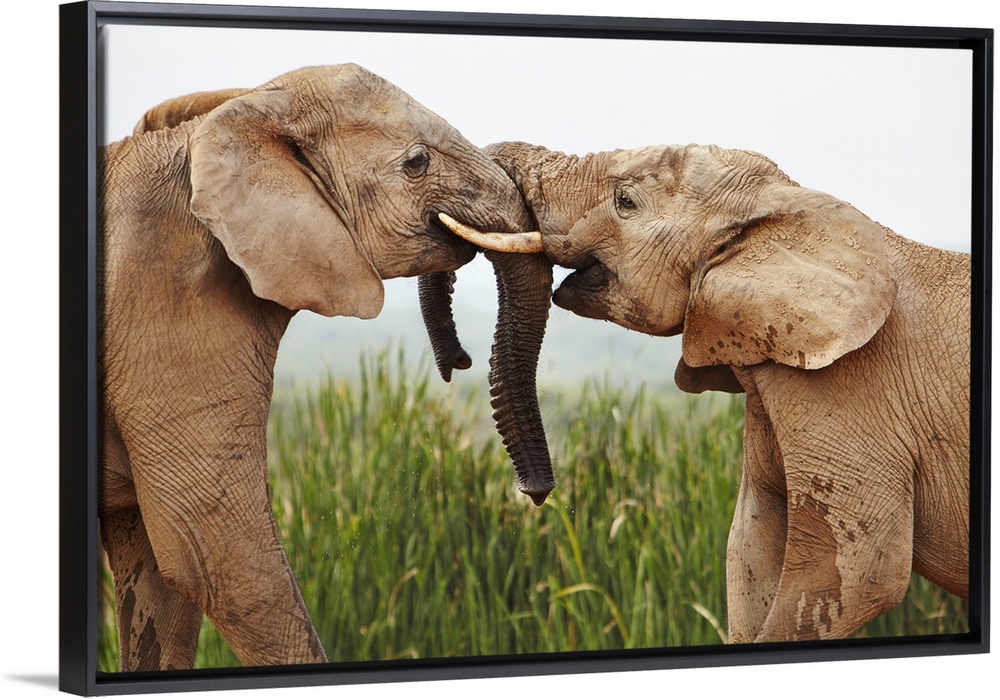 <p>South Africa, Western Cape, Port Elizabeth, Addo Elephant National Park, Young bull elephants greet each other at the waterhole, Addo Elephant Park.</p>
