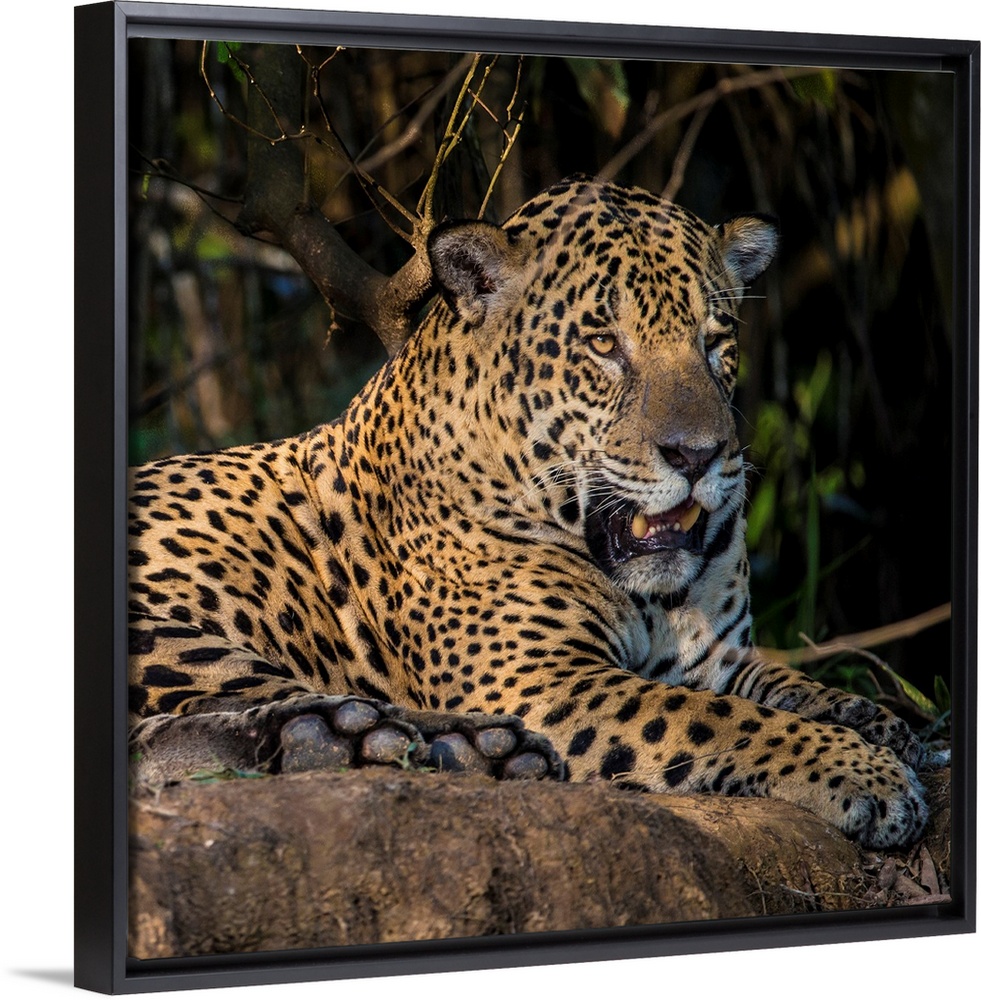 <p>South America. Brazil. A jaguar (Panthera onca), an apex predator, rests along the banks of a river in the Pantanal, the world's largest tropical wetland area, and a UNESCO World Heritage Site.</p>