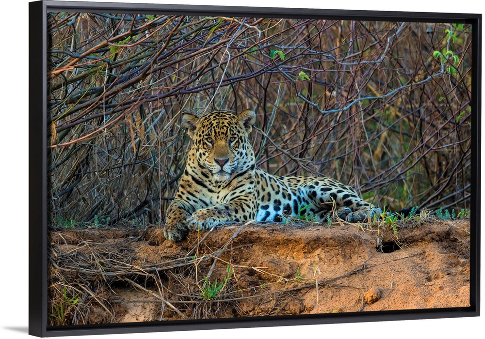 <p>South America. Brazil. A jaguar (Panthera onca), an apex predator, rests along the banks of a river in the Pantanal, the world's largest tropical wetland area, and a UNESCO World Heritage Site.</p>