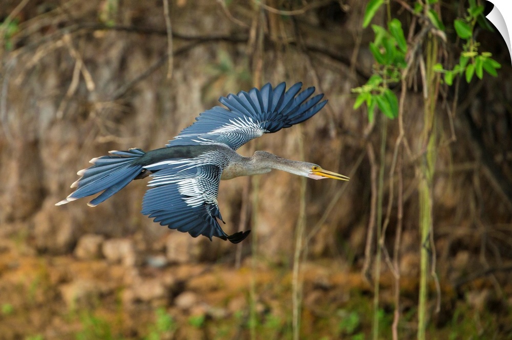 <p>South America. Brazil. An anhinga (Anhinga anhinga) flying along a river bank in the Pantanal, the world's largest tropical wetland area, and a UNESCO World Heritage Site.</p>