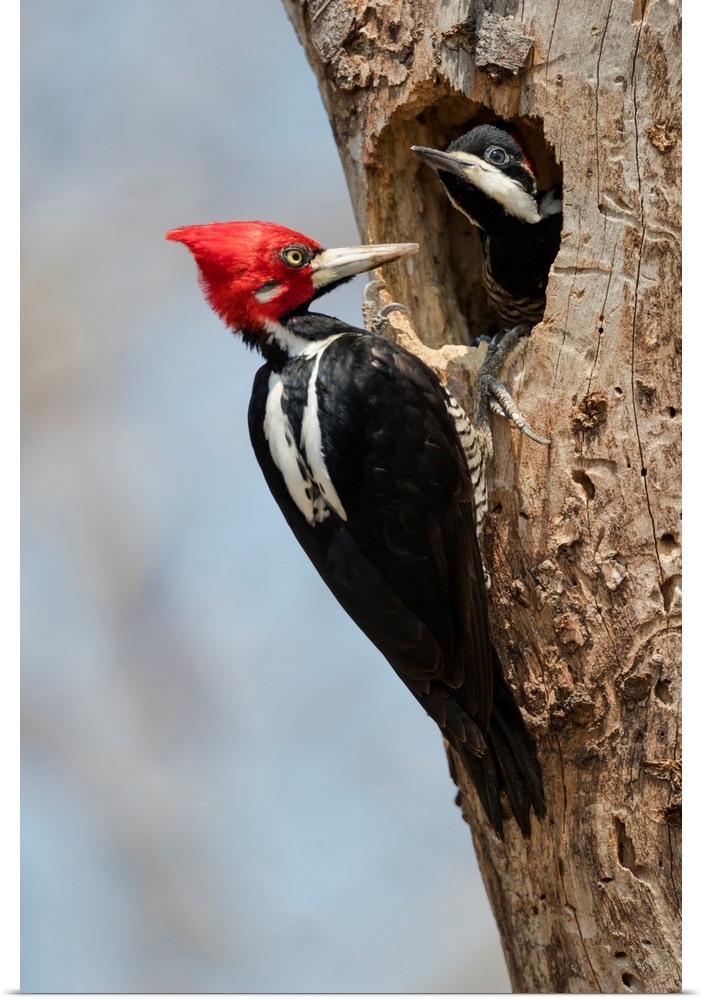 <p>South America, Brazil, The Pantanal, crimson-crested woodpecker, Campephilus melanoleucus. Male crimson-crested woodpecker at the nest hole with its young looking out.</p>