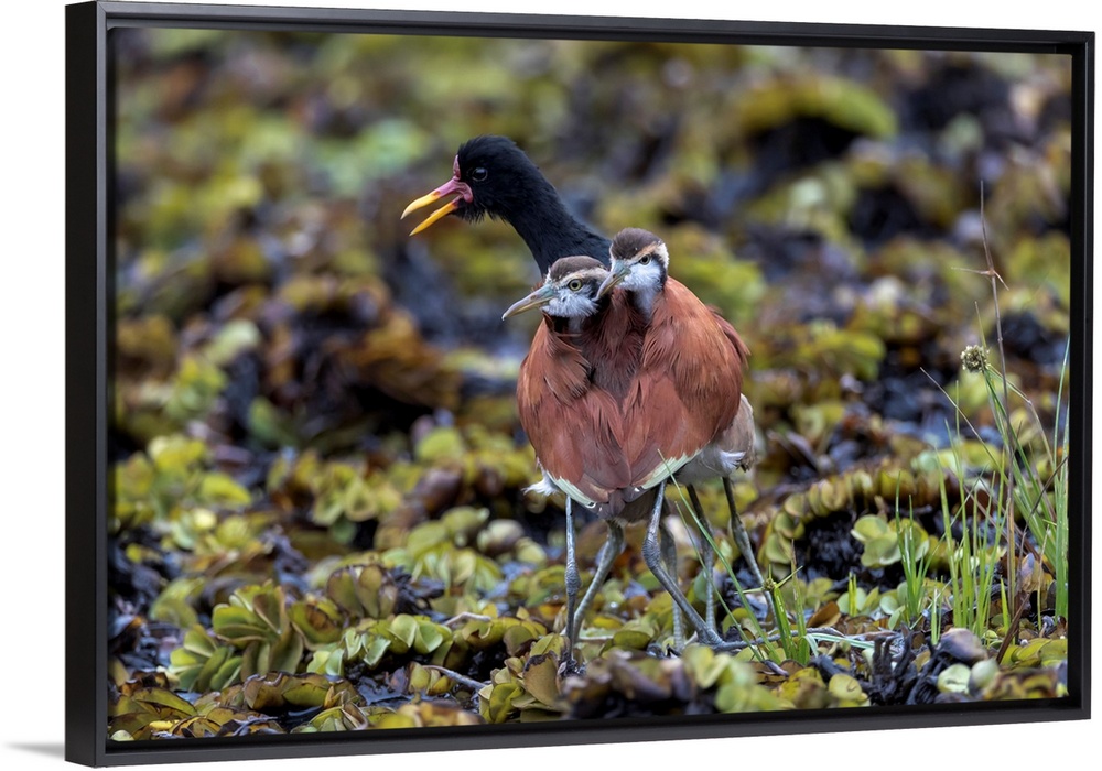 <p>South America, Brazil, The Pantanal, Rio Claro, wattled jacana, Jacana jacana. Male wattled jacana protecting its young from a perceived threat.</p>