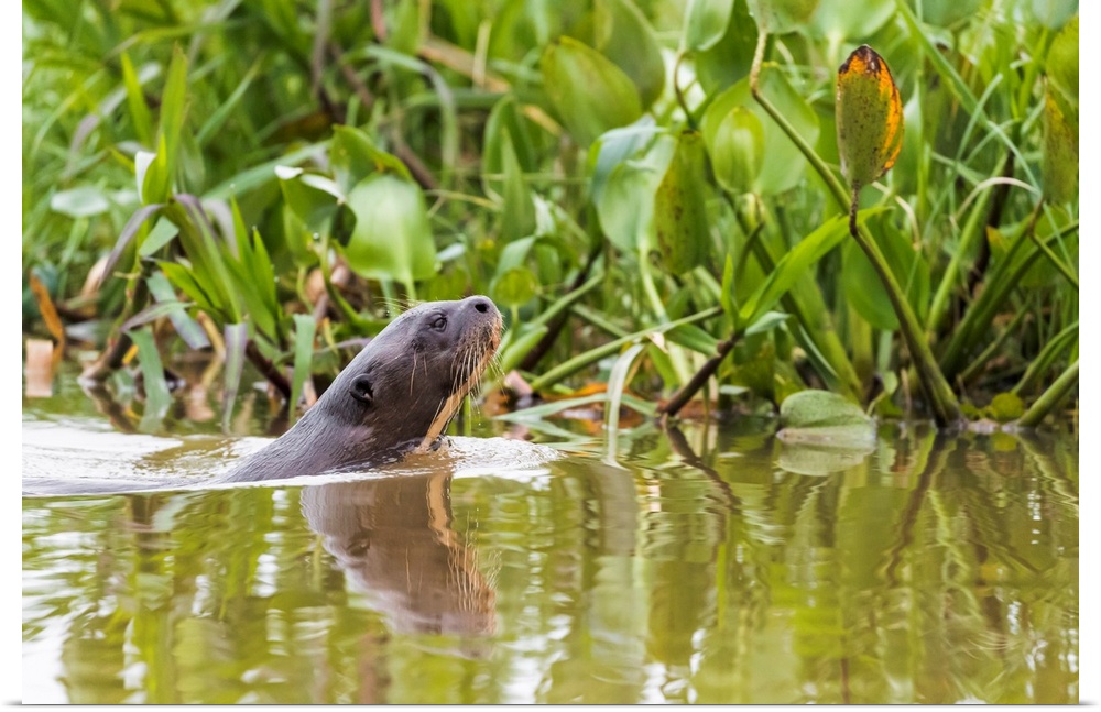 <p>South America, Brazil, The Pantanal, giant otter, Pteronura brasiliensis. A giant otter swims among the water hyacinth.</p>