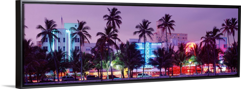 <p>View from the shore of Ocean Driveos art deco neon signs and palm trees.</p>