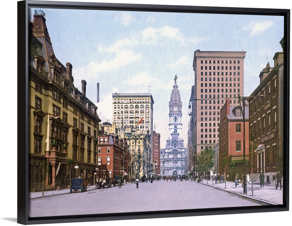<p>Giant, landscape, vintage photograph looking down South Broad Street in Philadelphia, a row of buildings on each side, leading toward city hall, the street filled with people walking.</p>