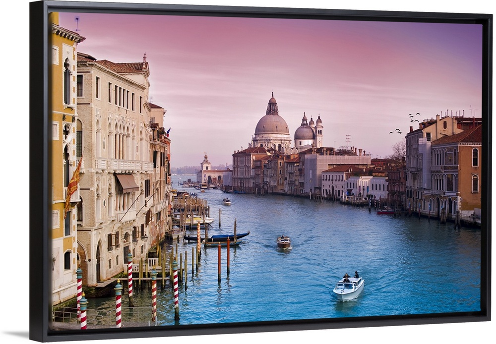 <p>Wall art of buildings on either side of an Italian canal with boats floating through the water.</p>