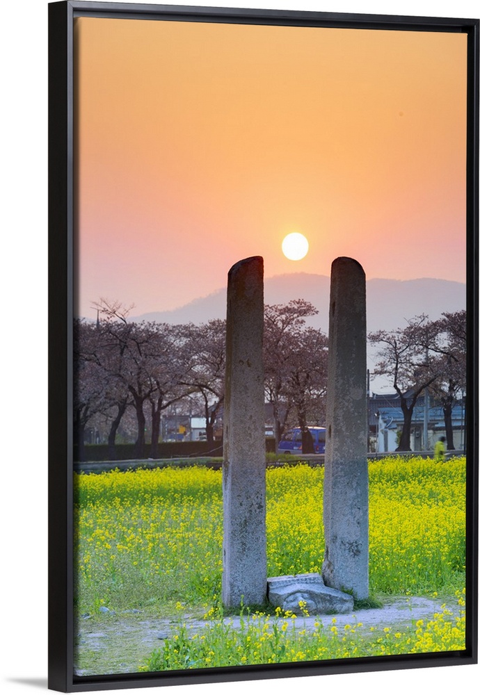 <p>Asia, Republic of Korea, South Korea, Gyeongsangbuk-do, Gyeongju, sunset at ancient flagpole, UNESCO site.</p>