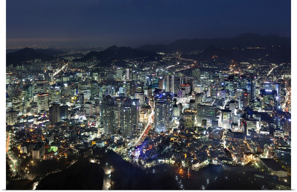 <p>Korea, South Korea, Seoul, Namsan Park, Northern view from N Seoul Tower, Myeong-dong District in the foreground and old Seoul districts at the foot of the hills in the background.</p>