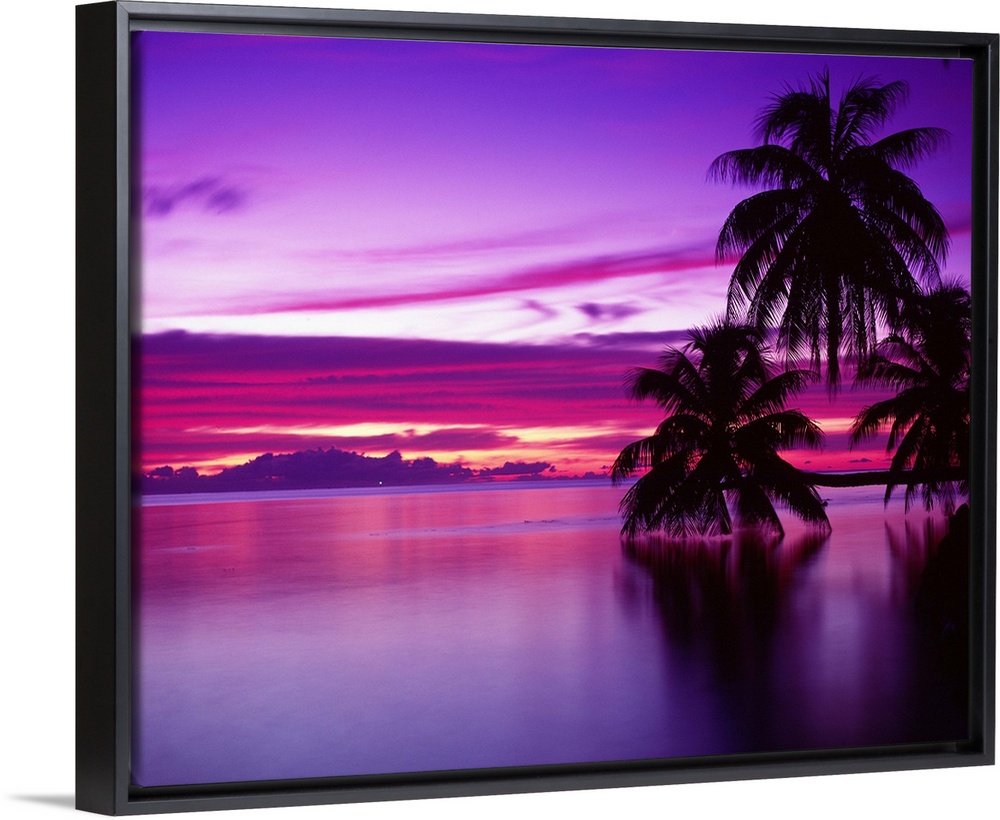 <p>Canvas photo art of a peaceful ocean with big palm trees silhouetted against a bright sunset.</p>