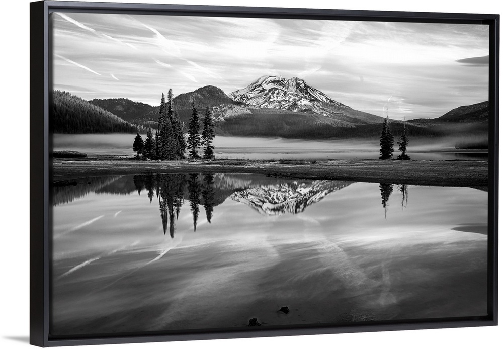 <p>Black and white landscape photograph of Sparks Lake in Oregon with South Sister Mountain in the background.</p>