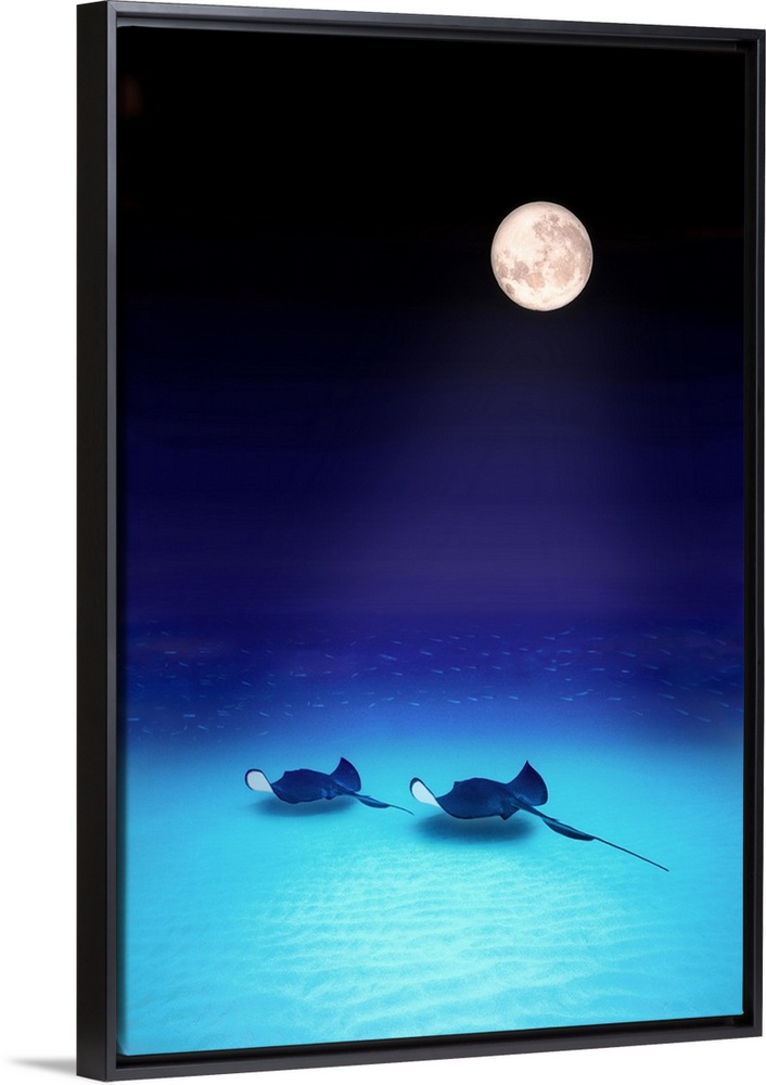<p>Two southern stingrays swim together along the sandy beach bottom as the full moon rays light their path.</p>