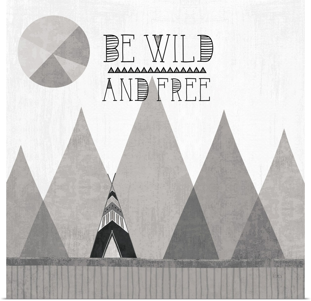<p>A square decorative design of a tent along mountains with the text 'Be Wild and Free', all in grey tones.</p>