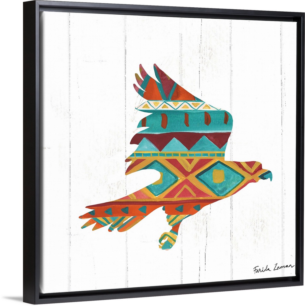 <p>An illustration of a hawk with a southwestern pattern on a white wood panel background.</p>