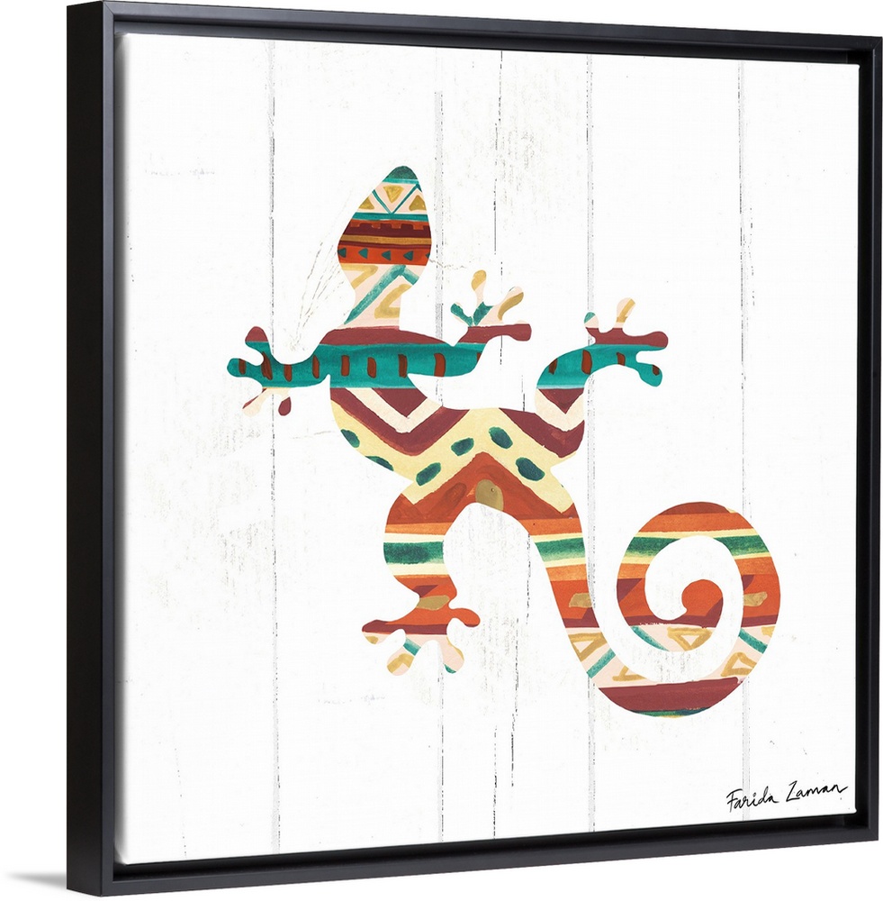 <p>An illustration of a lizard with a southwestern pattern on a white wood panel background.</p>