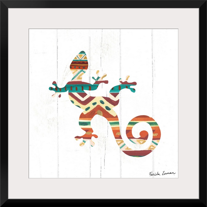 <p>An illustration of a lizard with a southwestern pattern on a white wood panel background.</p>