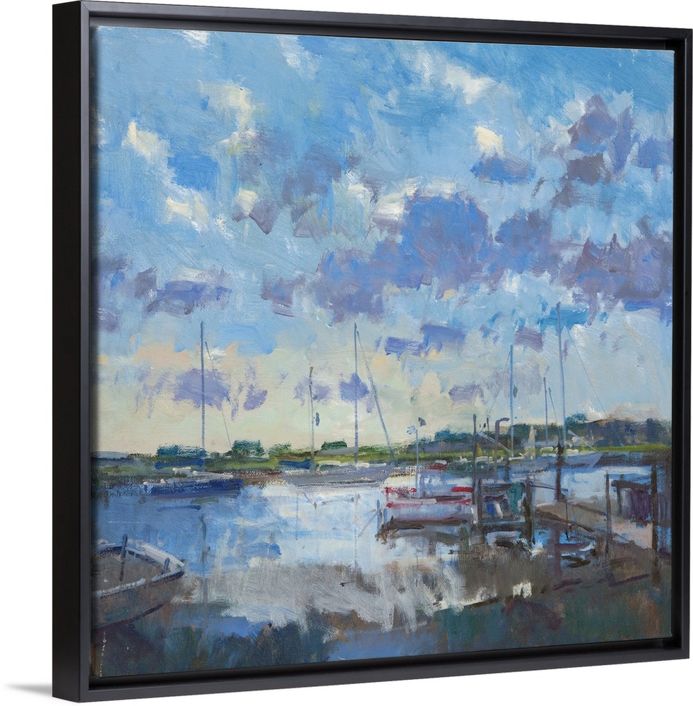 <p>Contemporary painting of boats in a harbor at dusk.</p>