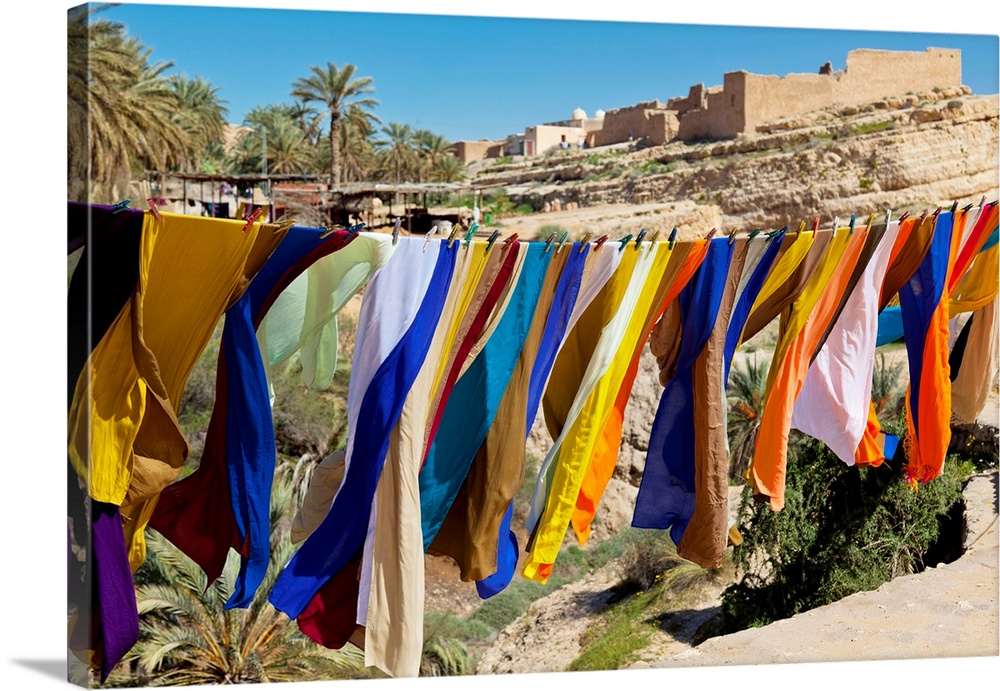 <p>Souvenir Scarves Flap In The Breeze Above The Canyon Near The Algerian Border; Mides, Tunisia, North Africa</p>