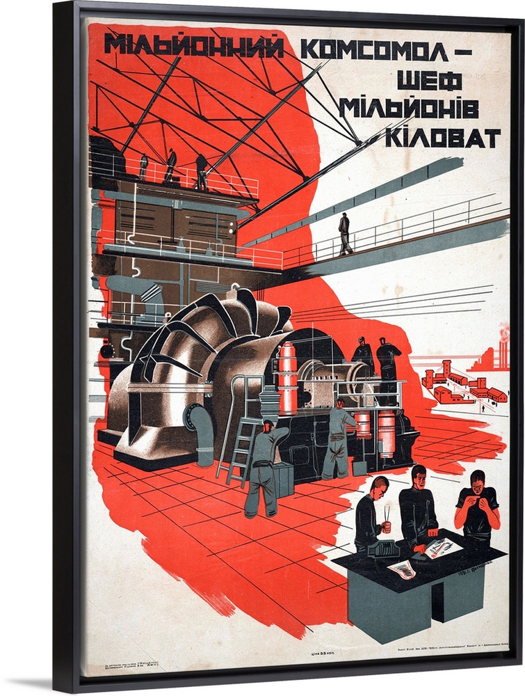 <p>Soviet propaganda poster by G. Gritsenko titled One Million Komsomoltsy - Master of One Million Kilowatts showing a Soviet power plant. Lithograph, 1931. Private collection.</p>