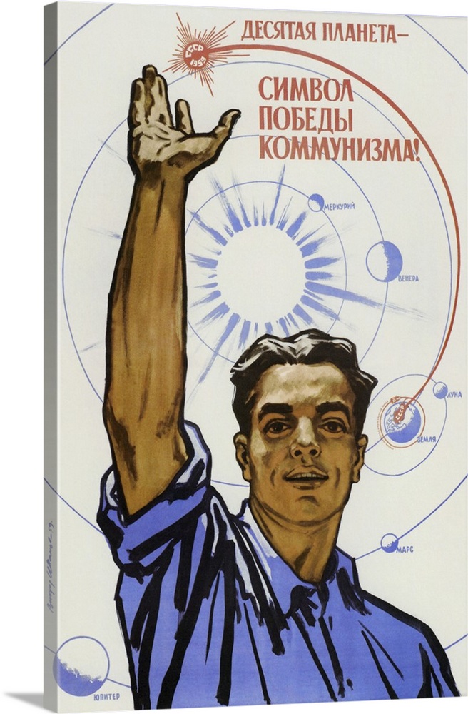 <p>Soviet space poster of a civilian raising his hand in the air, with a map of the solar system in background.</p>