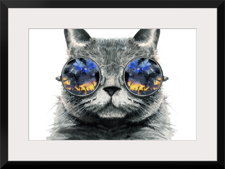 <p>A whimsical contemporary illustration of a cat wearing round sunglasses reflecting a starry outdoor night sky scene</p>