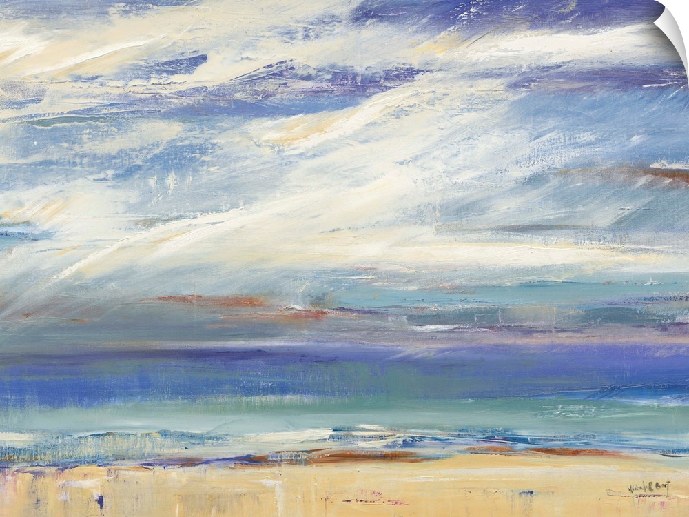 <p>Contemporary abstract painting representing a coastal landscape in blue, green, yellow, brown, and white hues.</p>