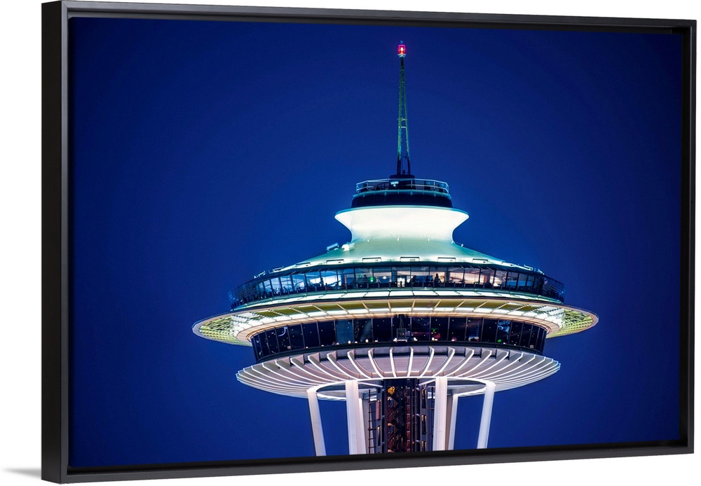 <p>Photograph of the top of the Seattle Space Needle lit up at night on a dark purple sky.</p>