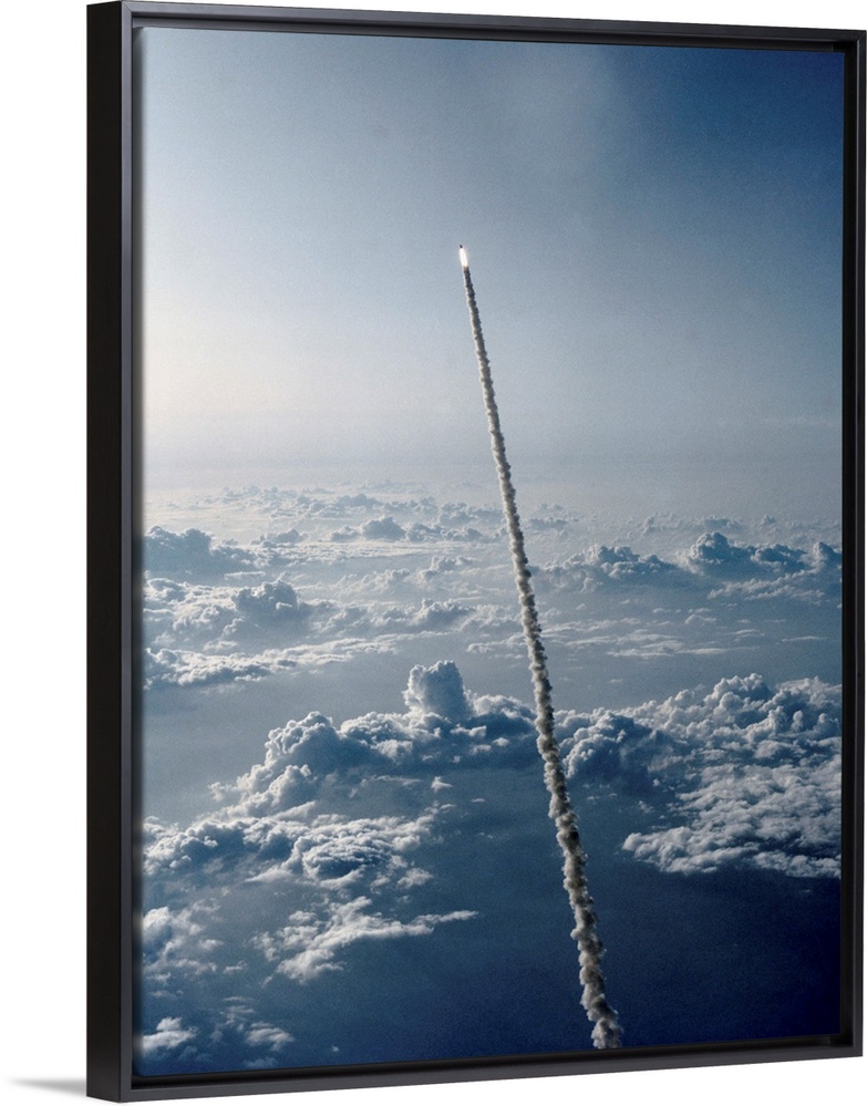 <p>High above the Kennedy Space Center and the Florida Atlantic coastline, the Space Shuttle Challenger heads toward its second Earth-orbital mission. The orbiter, its two-solid rocket boosters and external fuel tank are just a tiny dot atop the rapidly-lengthening plume of steam. Astronaut John W. Young, piloting the Shuttle training aircraft (STA) for his traditional weather-monitoring flight, used a 70mm handheld-Hasselblad to record this scene. Launch occurred at 7:33 a.m. (EDT) today.</p>
