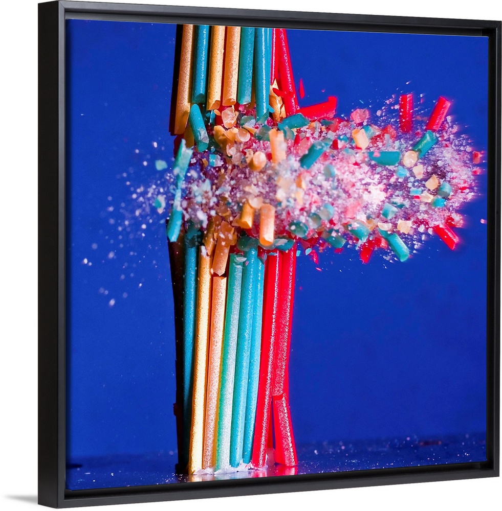<p>A small bundle of painted spaghetti breaking up from the impact of a pellet.</p>