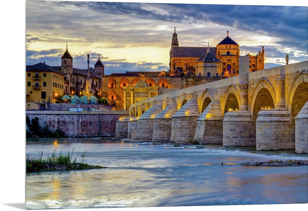 <p>Spain, Andalucia, Cordoba Province, Cordoba, Roman Bridge (Puente Romano) over Guadalquivir River and Mezquita (Mosque...Cathedral of Cordoba, UNESCO World Heritage Site)</p>