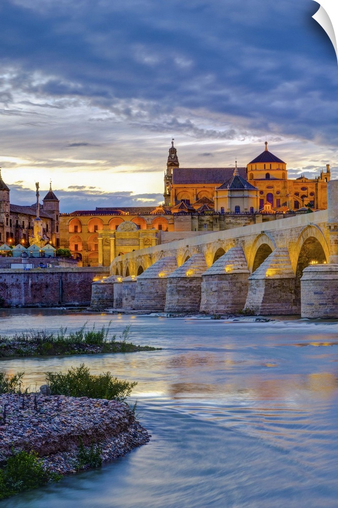 <p>Spain, Andalucia, Cordoba Province, Cordoba, Roman Bridge (Puente Romano) over Guadalquivir River and Mezquita (Mosque...Cathedral of Cordoba, UNESCO World Heritage Site)</p>