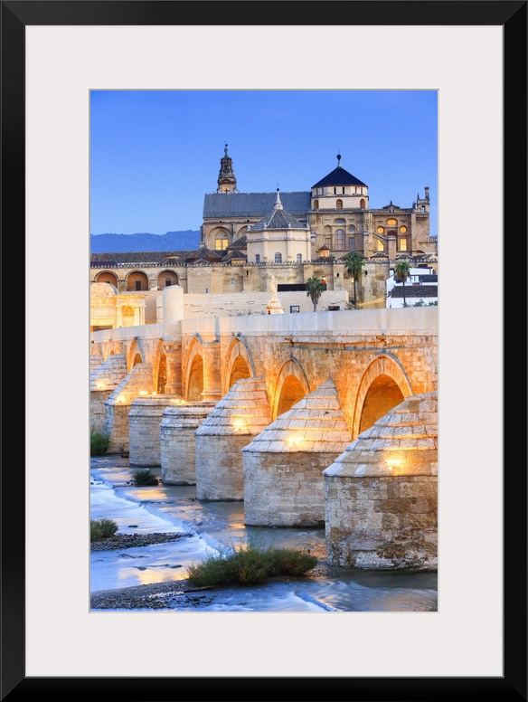 <p>Spain, Andalusia, Cordoba district, Cordoba, La Mezquita Cathedral with the Roman bridge and Guadalquivir River at dusk</p>