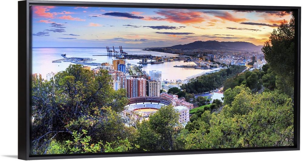 <p>Spain, Andalusia, Malaga district, Malaga, Cityscape with the famous bullring at sunset, view from Monte de Gibralfaro</p>