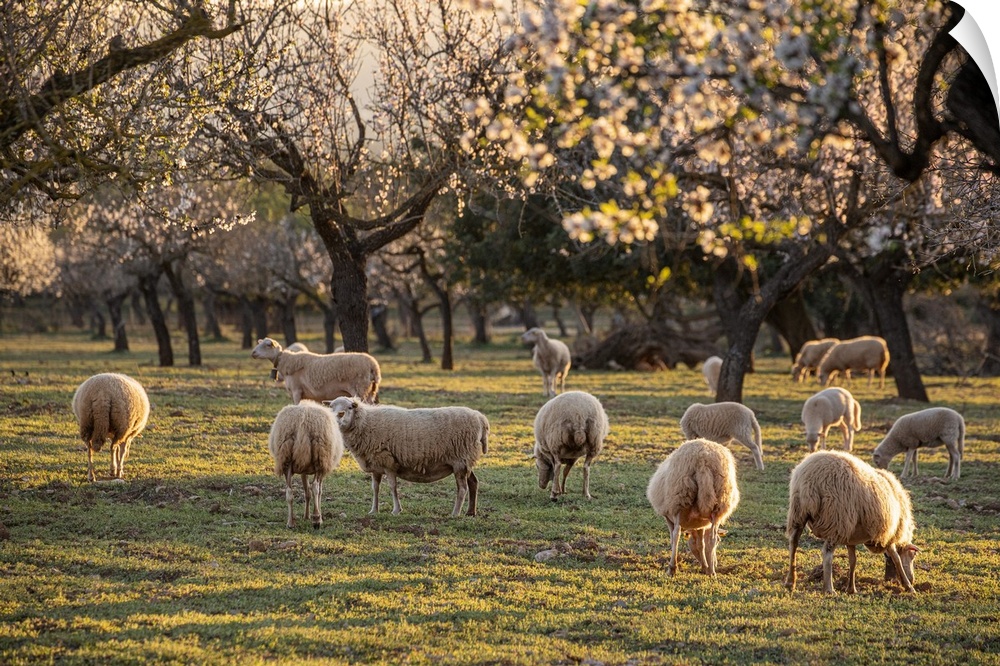 <p>Spain, Balearic Islands, Mallorca, Palmanyola, Serra de Tramuntana, Flock of sheep near Palmanyola, almond blossom in spring.</p>