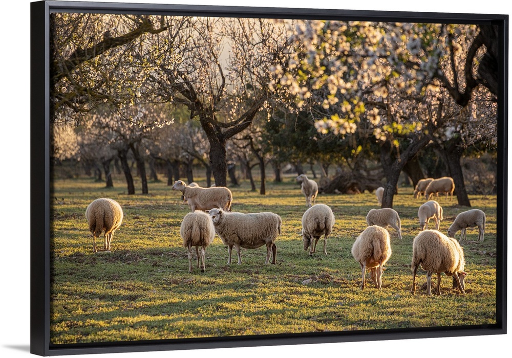 <p>Spain, Balearic Islands, Mallorca, Palmanyola, Serra de Tramuntana, Flock of sheep near Palmanyola, almond blossom in spring.</p>