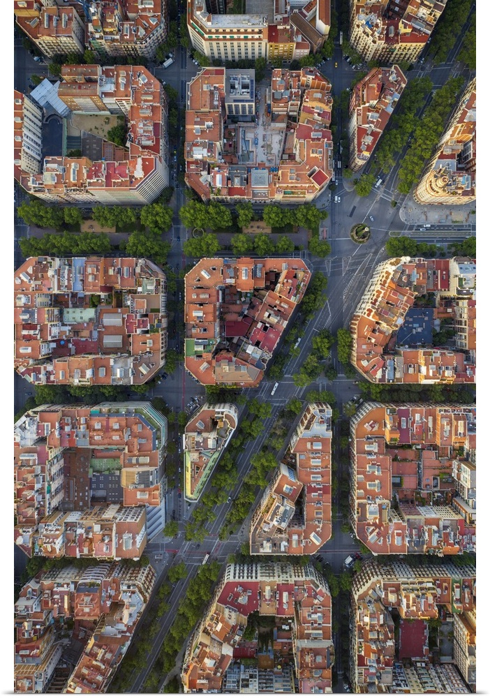 <p>Spain, Catalunya, Barcelona, Aerial view of Eixample district and Sagrada Familia Cathedral.</p>