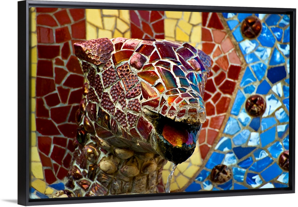 <p>Spain, Barcelona, Park Guell, Mosaic Dog decorating entrance.</p>