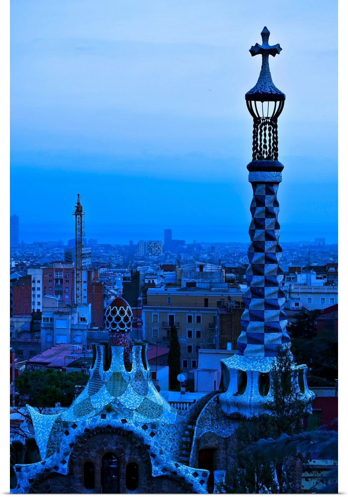 <p>Spain, Barcelona, Park Guell, Roof detail of Gate houses at entrance, Blue tone.</p>