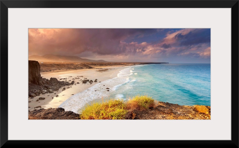 <p>Spain, Canary Islands, Fuerteventura, Beach and rugged coastline at dawn.</p>