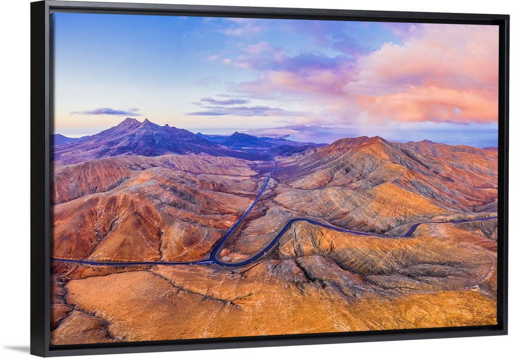 <p>Spain, Canary Islands, Fuerteventura, mountain road crossing the volcanic landscape near Sicasumbre astronomical viewpoint</p>