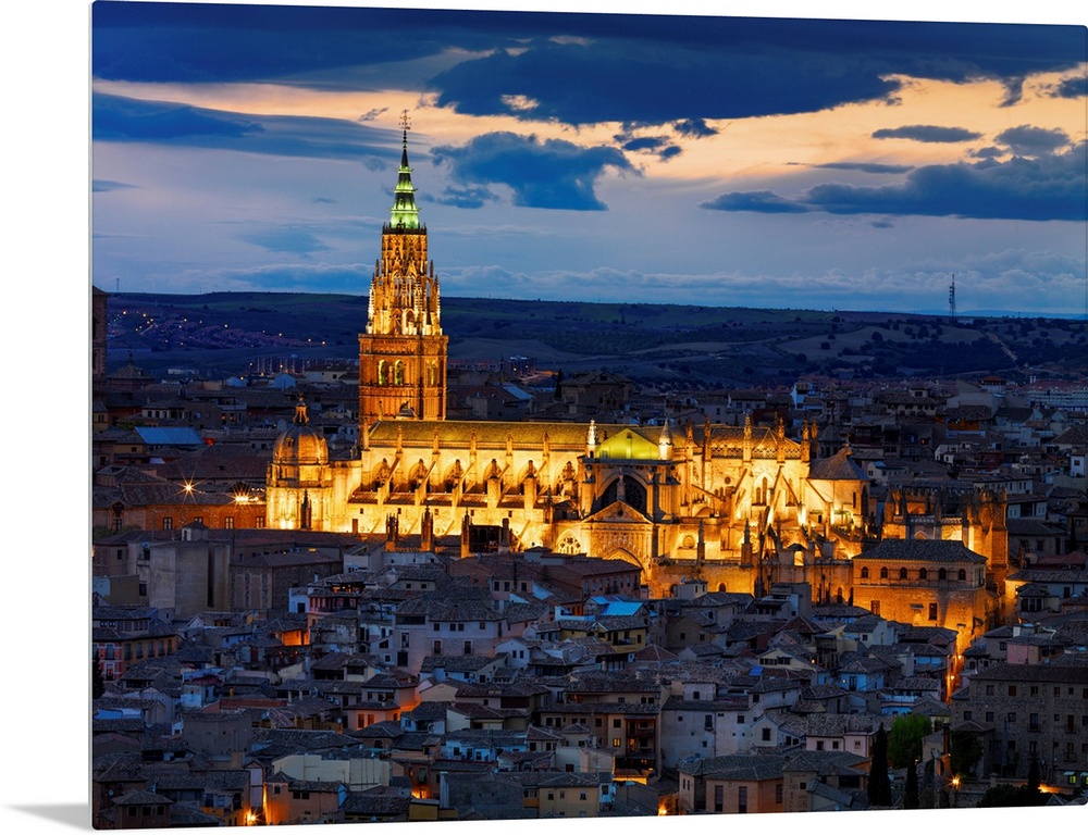 <p>Spain, Castile La Mancha, Toledo, Cathedral of Toledo, Overview of city at dusk, UNESCO World heritage site.</p>